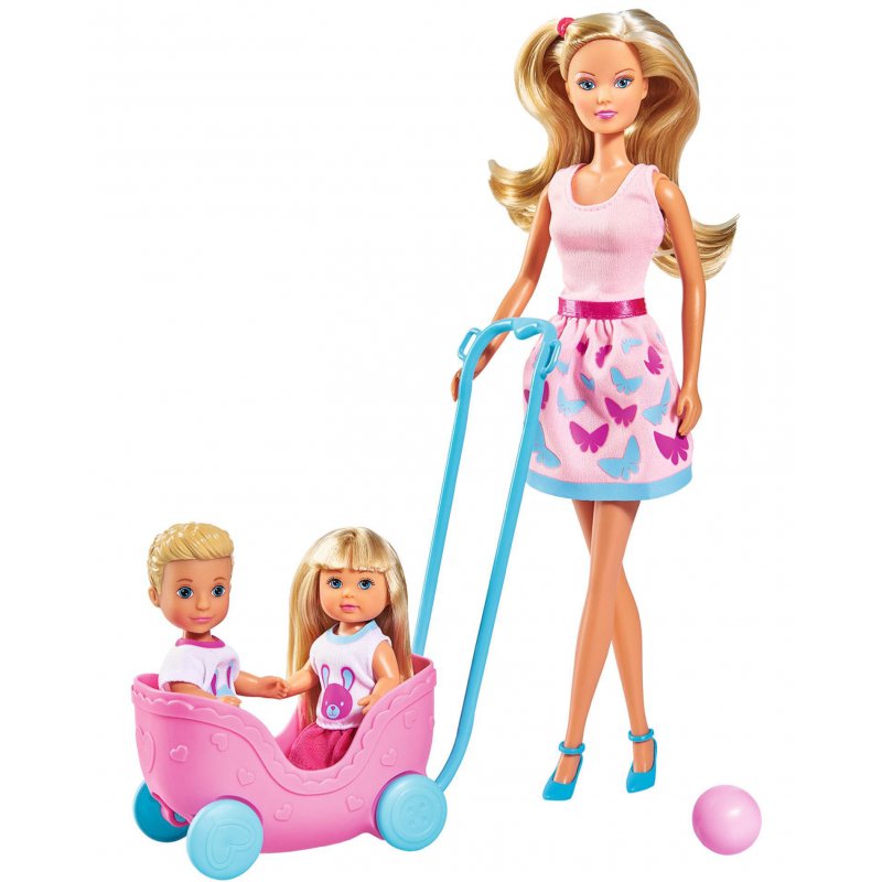 W zestawie: Steffi - ubrana w różową bluzkę, spódnicę w motyle i w niebieskie sandałki na obcasie, dwójka dzieci - Evi i Timmy, dziewczynka ubrana w różową spódniczkę, a chłopiec w niebieskie spodenki, dodatkowo różowy wózek z błękitnymi kółkami.