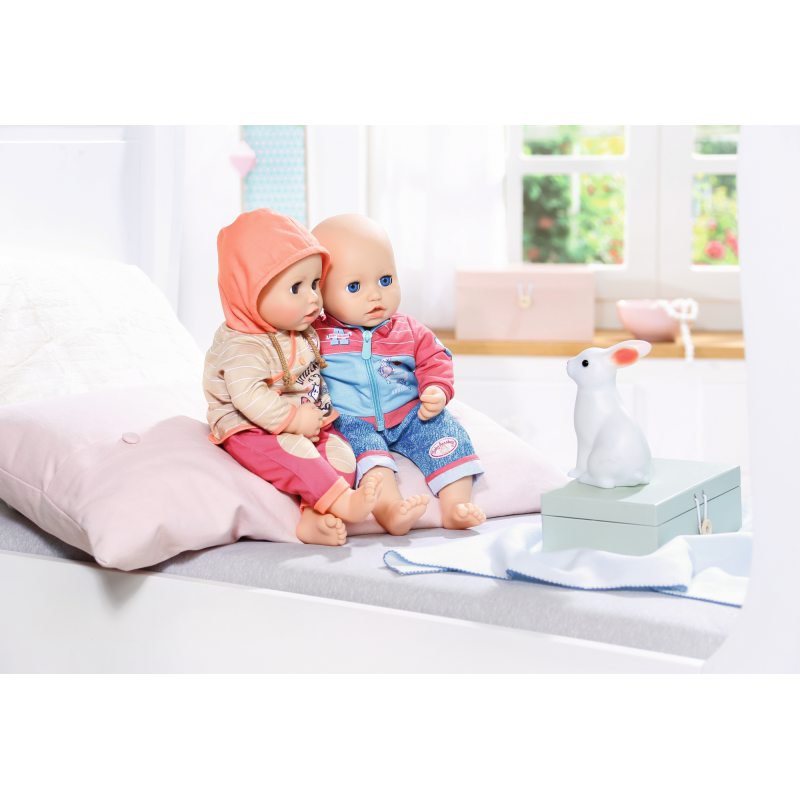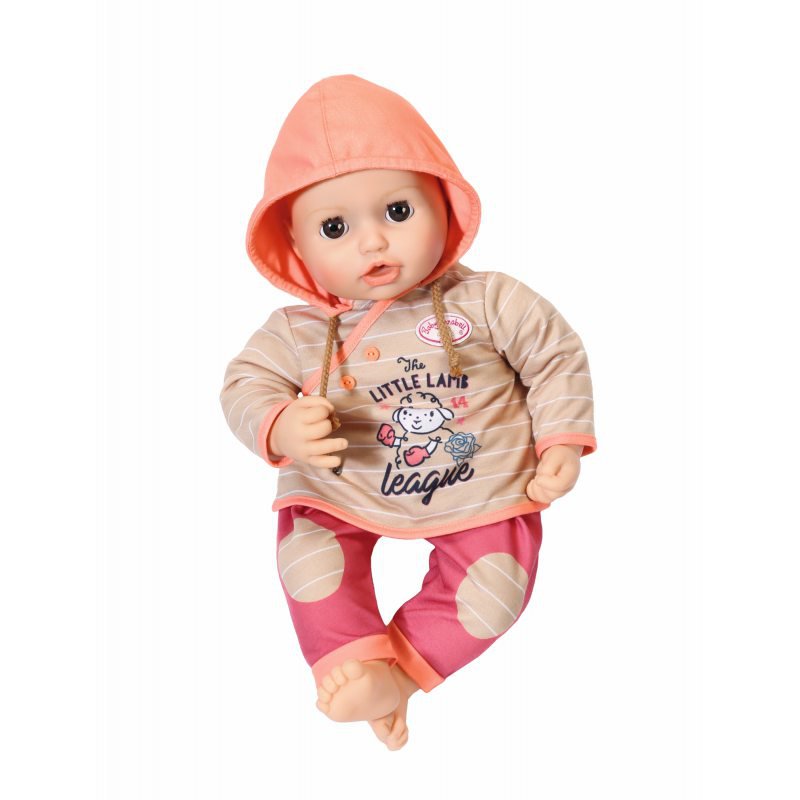 Zestaw wygodnych, koralowych spodni i beżowej bluzy z kapturkiem w białe paseczki, z motywem owieczki zachwyci każdą "małą mamę". Do ubranka dołączono oryginalny wieszaczek z kolekcji Baby Annabell.Ubranko przeznaczone jest dla lalki Baby Annabell do wysokości 46 cm.