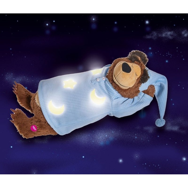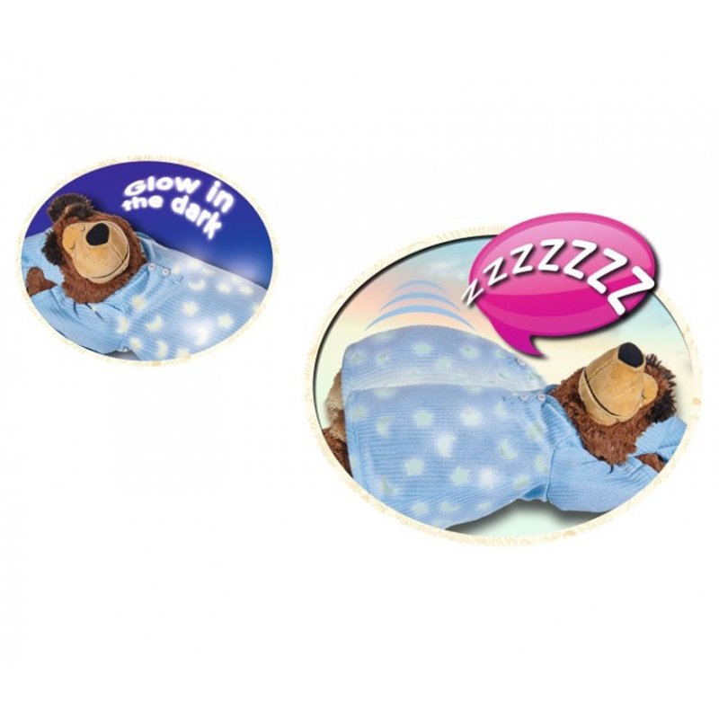 Naciśnij lewy łokieć Miszy, a on zacznie chrapać, jego brzuszek natomiast zacznie się ruszać. Ubranko Miszy ozdobiono świecącymi w ciemności gwiazdkami. Maskotka ubrana w nocną niebieską koszulę oraz czapeczkę z pomponem w tym samym kolorze.