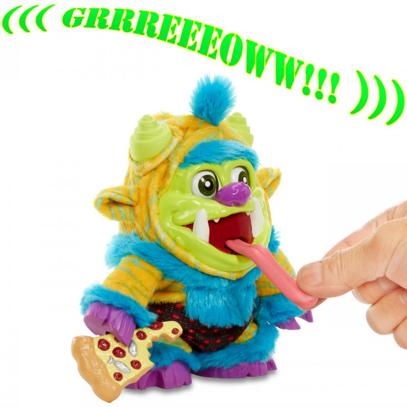 Gdy pociągniesz za język, stwór wibruje, wydaje wesołe dźwięki a oczy świecą wewnątrz opakowania.
