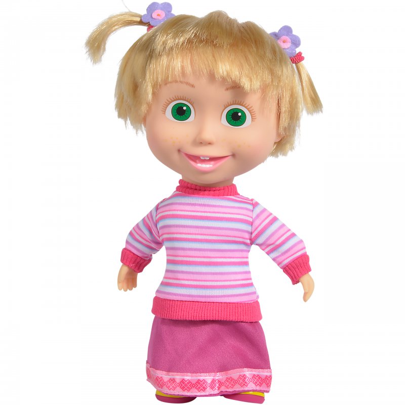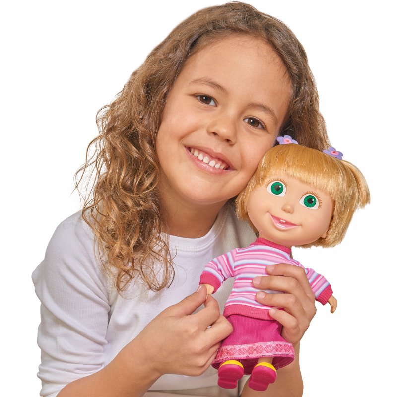 Masza to ciekawa świata kilkuletnia dziewczynka o krótkich blond włosach i dużych zielonych oczach. Ubrana jest ona w różowy sweterek w paski i różową spódniczkę. Masza ma rozpuszczone włosy i dwa małe kucyki związane gumkami w kształcie kwiatków. Na nogach ma śliczne różowe buciki Lalka prezentuje się bardzo ładnie i wiernie odzwierciedla serialową bohaterkę.