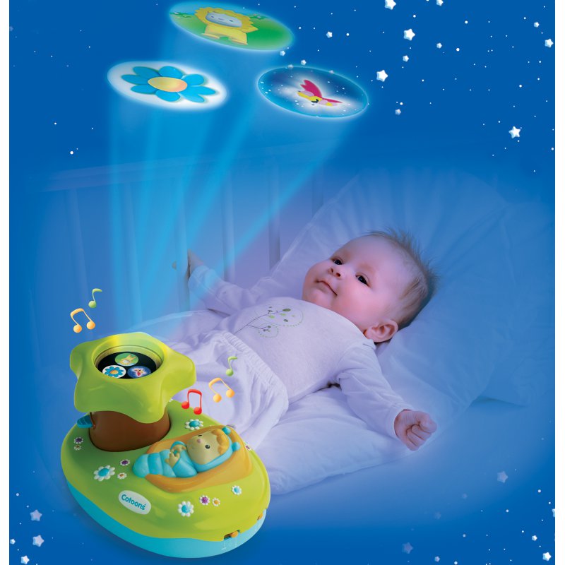 Nocna lampka projektor Cotoons świetlny w kształcie pełnej kwiatów wyspy z domkiem pełniącym funkcję projektora pomoże szybciej zasnąć Twojemu maluchowi. Projektor rzuca na sufit śliczne motywy Cotoons - w zestawie 3 różne obiektywy do wyboru. Cicha muzyka sprawi, że maluch przeniesie się w świat dziecka i z chęcią będzie zasypiać w swoim pokoiku przy zgaszonym świetle. Opcjonalnie może także usypiać malucha miłą Cotoons-melodią, której czas grania można ustawić na 5, 10 lub 15 minut. Idealny dla dzieci od 0 do 36 miesięcy. Zapraszamy do magicznego świata marzeń francuskiej firmy Smoby - Cotoons.