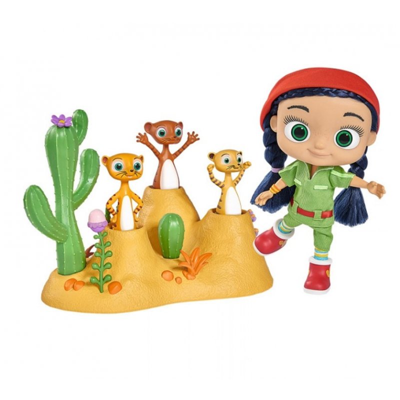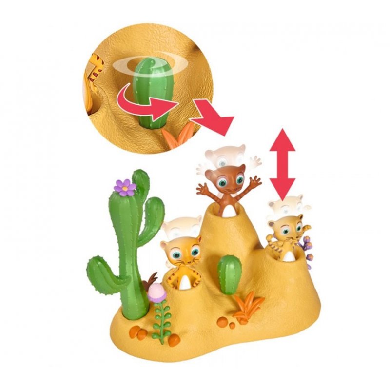 Umieść surykatkę Monty i jej dwie towarzyszki w otworach wydmy i przekręcaj małego kaktusa pośrodku, a figurki będą na przemian podskakiwać. Szalej z Monty i parą jej przyjaciół, kurz i brud nie będą straszne, gdy przebierzesz lalkę Wissper w dołączony tu strój safari i zmienisz jej buty.