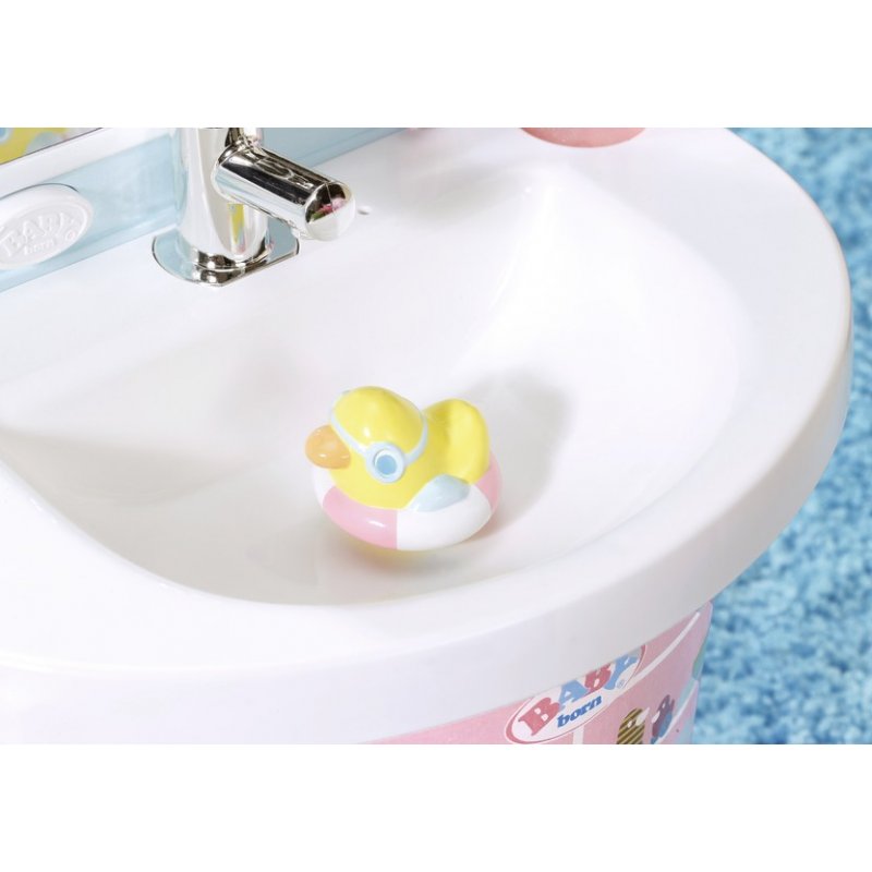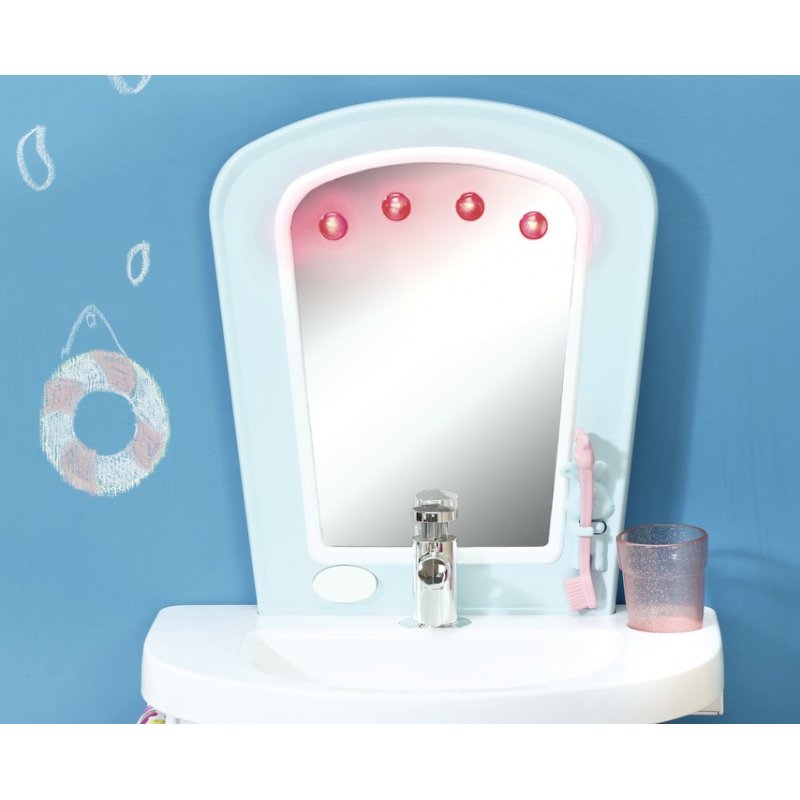 Przy umywalce umieszczone jest duże lustro ze świecącymi lampkami i przyciskiem uruchamiającą melodię Baby Born, odgłosy mycia i towarzyszącej jej zabawy.