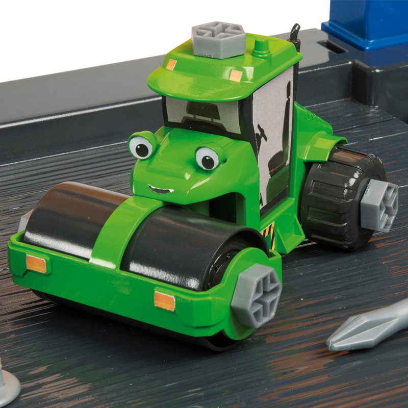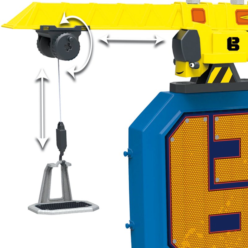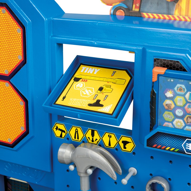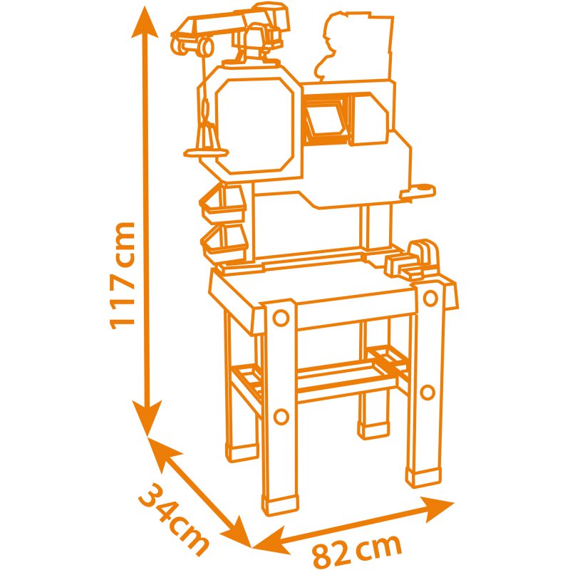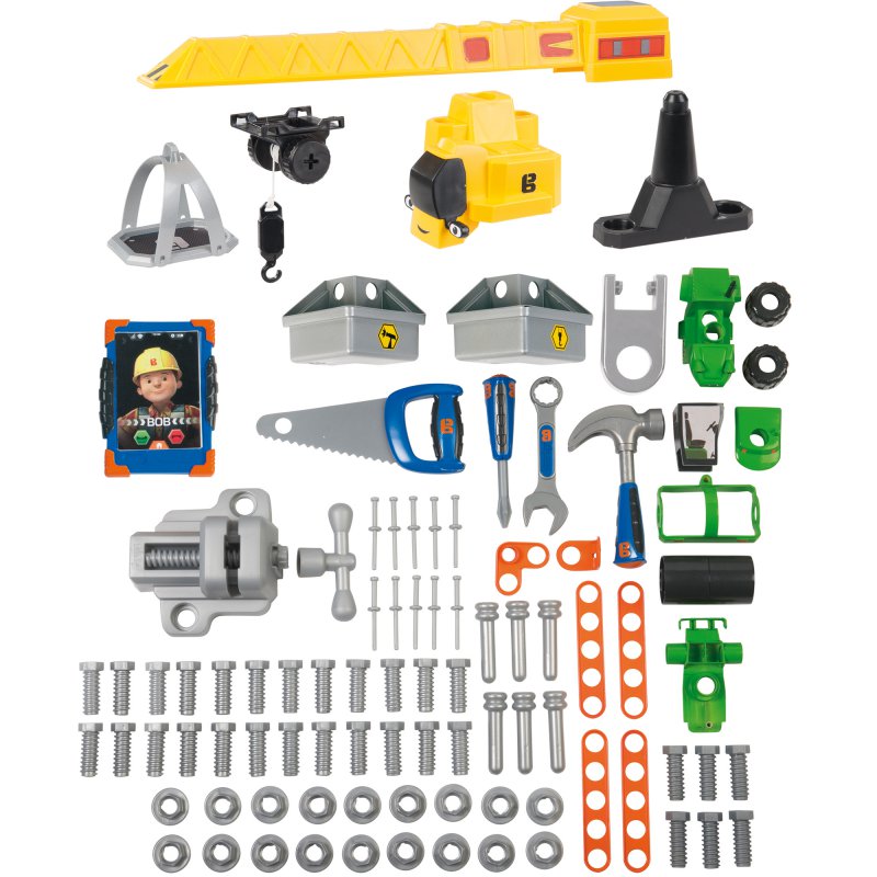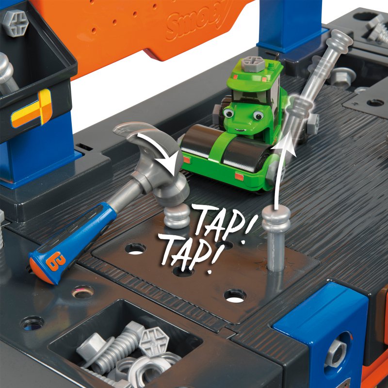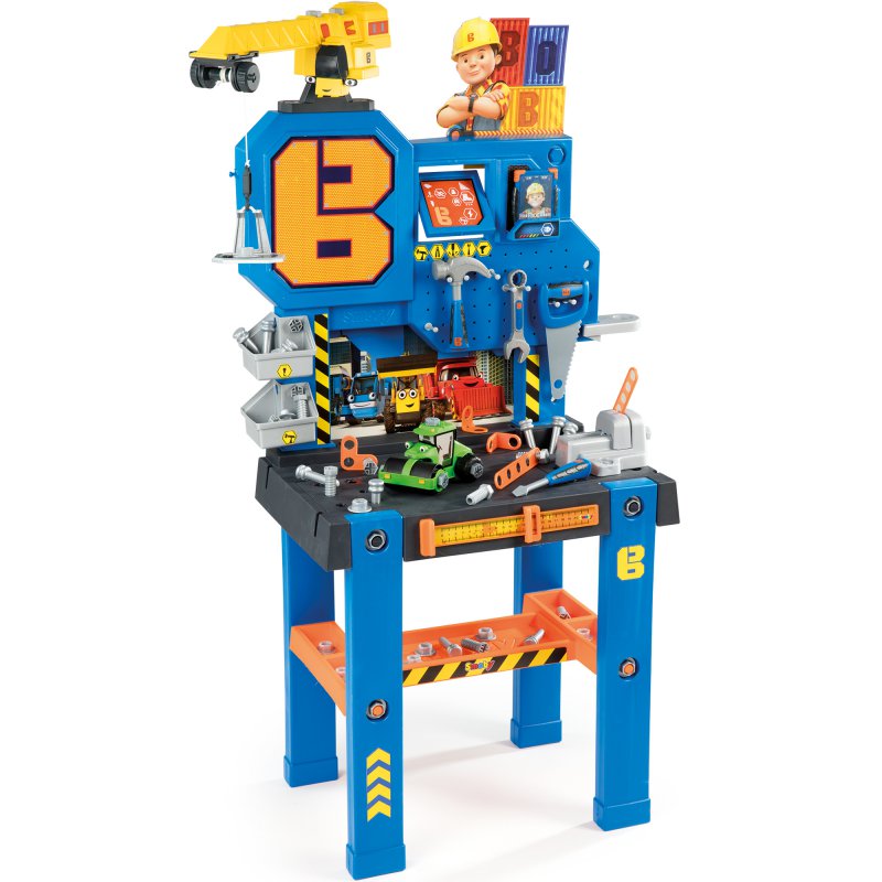 Duży zestaw, w skład którego wchodzi warsztat z imadłem, dźwig z wyciągarką, klucz, piła, młotek, śrubokręt, różne śrubki i nakrętki. Warsztat został wyposażony w sumie w aż 92 elementów. W zestawie znajdują się elementy do złożenia zielonego walca. Wszystkie narzędzia są lekkie, bezpieczne i wygodne dla dziecięcych rączek. Liczne uchwyty w blacie i ściance warsztatu oraz niezwykle praktyczne kuwetki i wygodna półka pod blatem, pomagają utrzymać porządek w trakcie i po zabawie.
