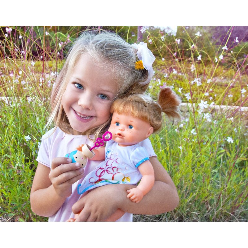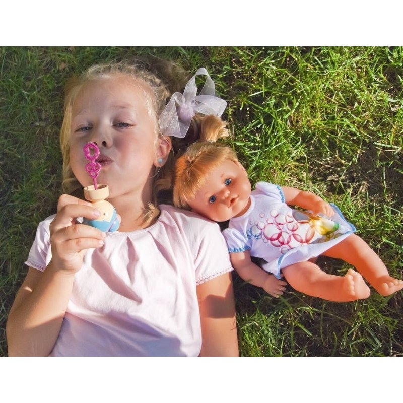 Każda mała dziewczynka chciałaby mieć taką lalkę, aby mogla przytulać i opiekować się nią. Lalka ubrana jest w śliczne ubranko z bąbelkowym wzorem.