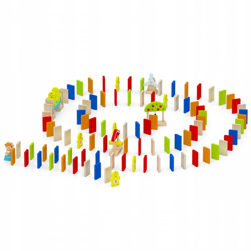 Klasyczna zabawa, która dostarczy mnóstwo radości dzieciom w różnym wieku. W zestawie znajdziemy 116 kolorowych elementów wykonanych z drewna bukowego, pomalowanego nietoksycznymi farbami. Zabawa polega na ułożeniu prostokącików, kurczaczków i innych elementów z farmy tak, by po przewróceniu pierwszego klocka stworzyć reakcję łańcuchową. Domino pozytywnie wpływa na rozwój dzieci. Rozwija umiejętności motoryczne, koordynację ręka – oko, umiejętność planowania oraz zachęca do twórczego myślenia i kreatywności.