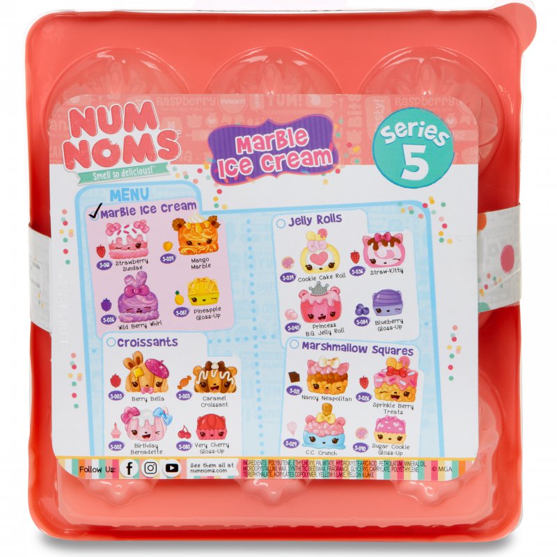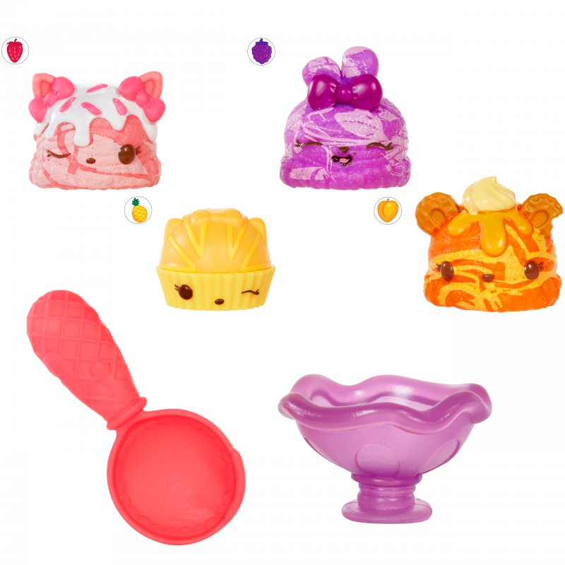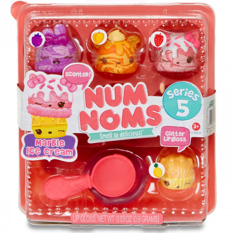 W opakowaniu znajdziemy 3 zapachowe Numy (Strawberry Sundae, Mango Marble, Wild Berry Whirl)) oraz 1 zapachowy Nom (Pineapple Gloss-Up), który jest teraz zapachowym i brokatowym błyszczykiem do ust.