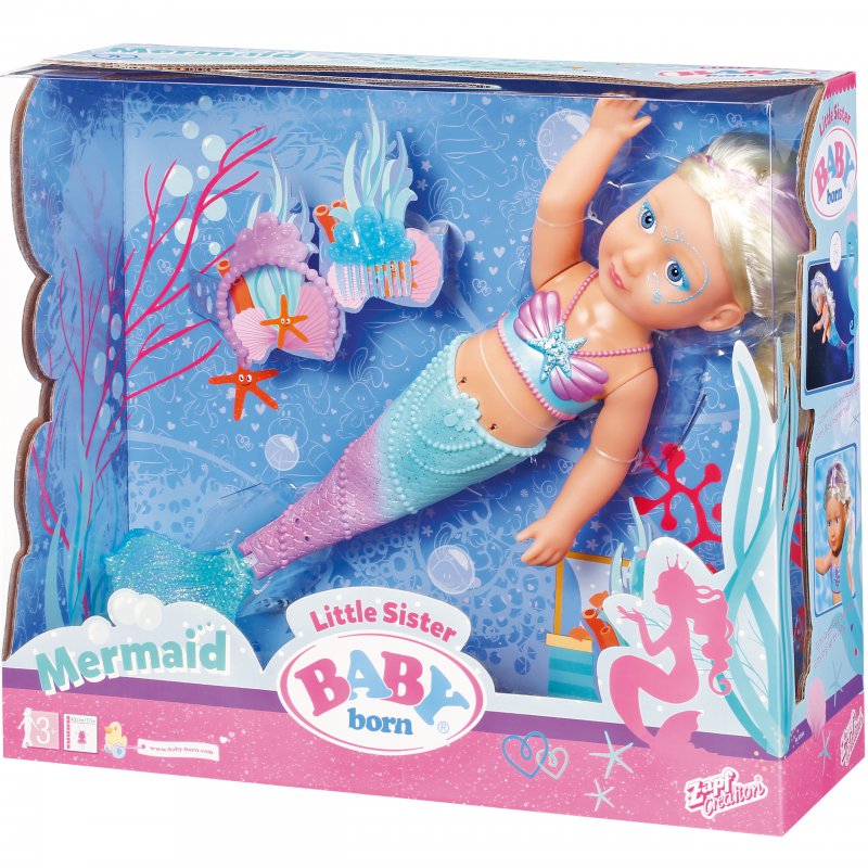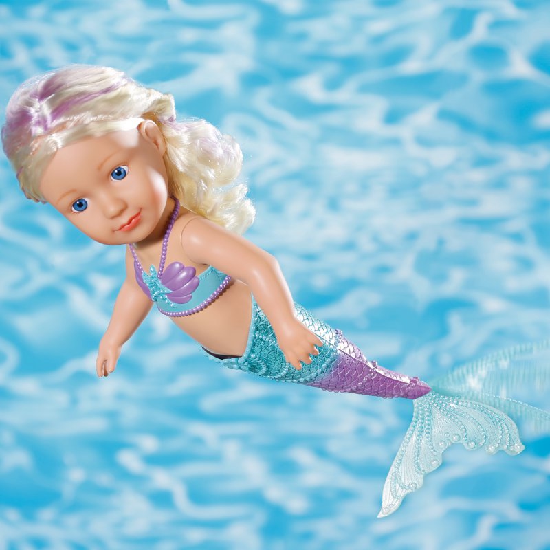 Rodzina lalek Baby born powiększa się o nową lalkę syrenkę, która posiada wyjątkową funkcję. Po włożeniu do wody lalka pływa samodzielnie. Teraz każda kąpiel będzie magiczna, Baby born występuje jako prześliczna syrenka, która uwielbia „podwodne” przygody w wannie lub basenie. Lalka ma na sobie top, fioletowo-turkusowy połyskujący brokatem ogon oraz płetwę, jej szyję zdobi naszyjnik z zawieszką mieniącą się turkusową gwiazdką. Długie blond włosy z fioletowymi pasemkami można układać w różne fryzury, przy pomocy dołączonego grzebienia, a całość ozdobić fioletowym diademem. Rozpocznij wodną przygodę wspólnie ze swoją ulubioną lalką Baby born.