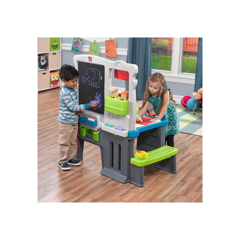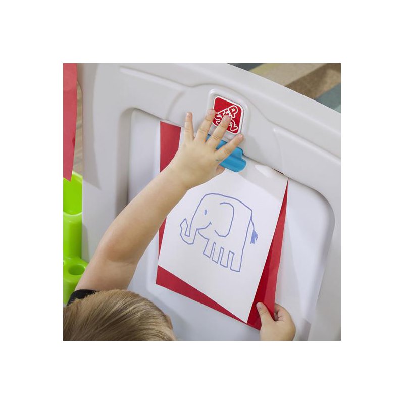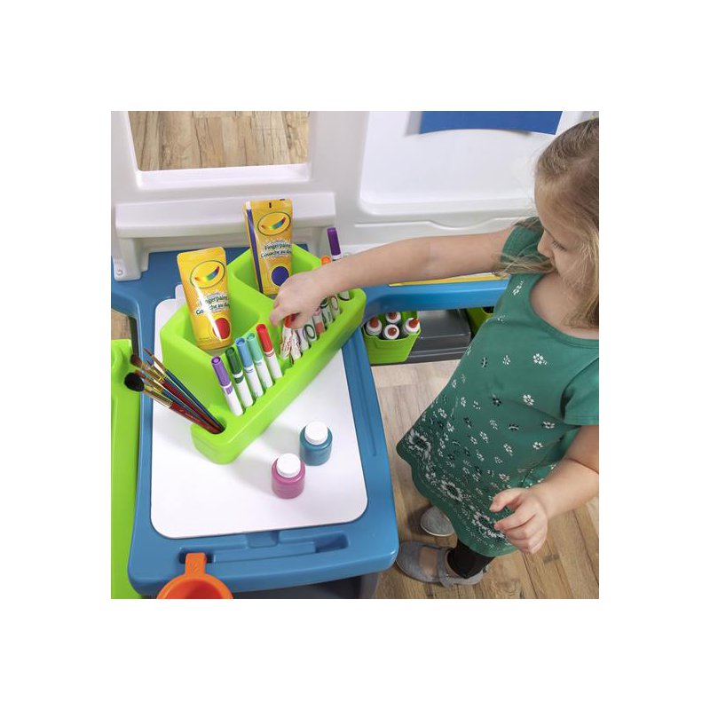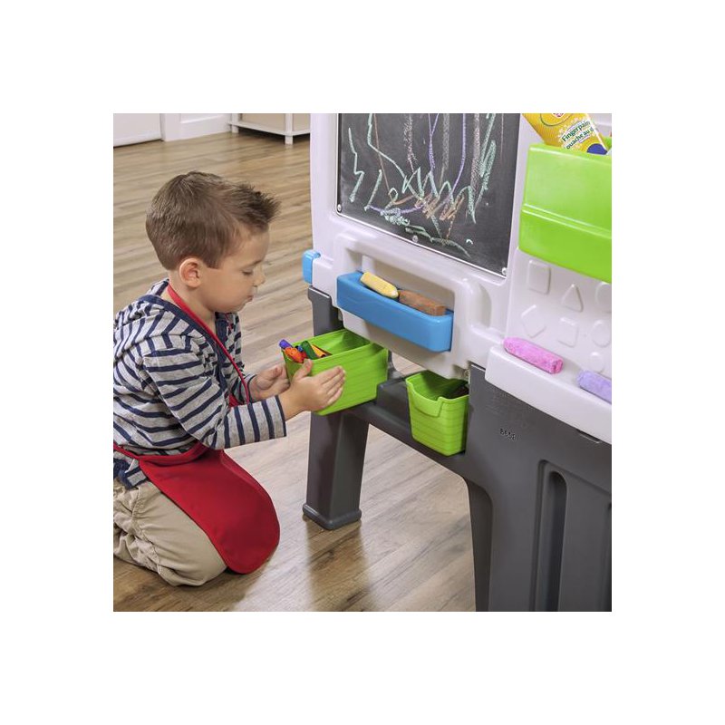 Wielkie centrum małego artysty będzie spełnieniem marzeń każdego dziecka. W zestawie znajdziemy biurko z siedziskiem, schowki, półki, pojemniki na wszystkie akcesoria i przybory malarza, tablice kredową, dwie sztalugi z klipsami - jedną większą, przy której dziecko może malować (i po której móżna pisać mazakami) i jedną mniejszą, która może umożliwić ekspozycję prac.