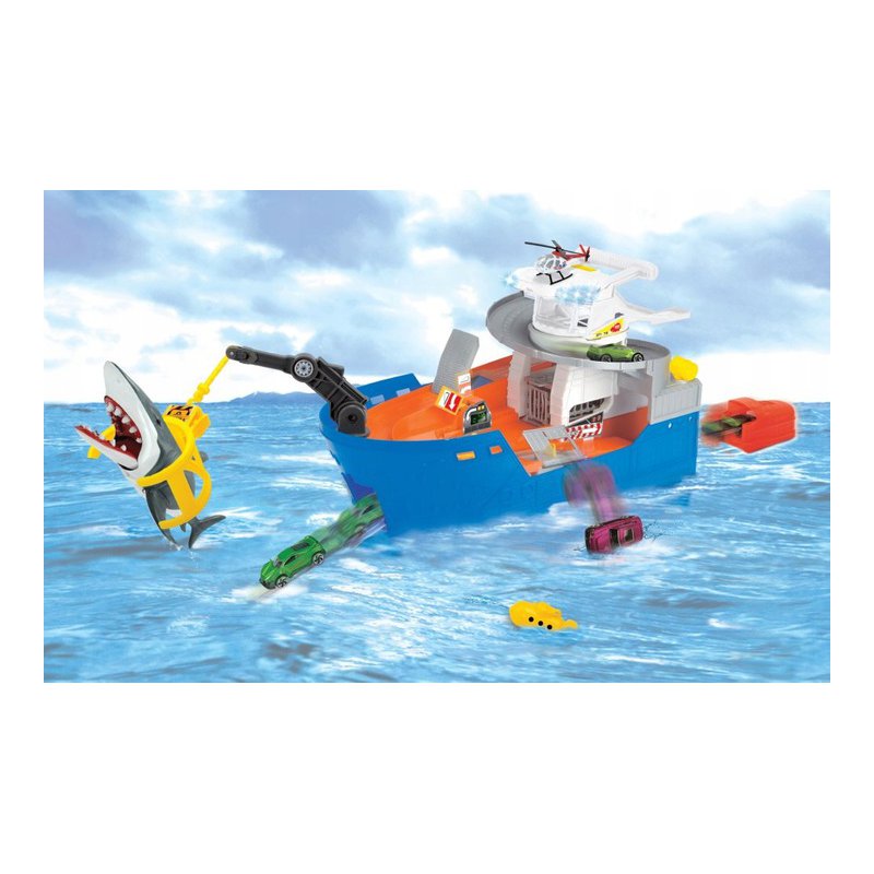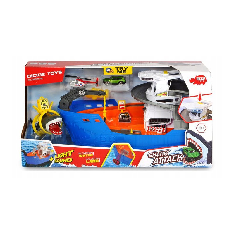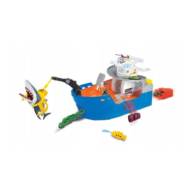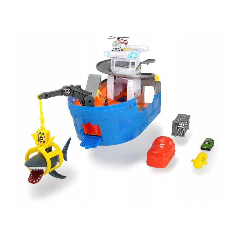 Zestaw Rekin Atakuje Statek z dźwiękiem i światłem nie jest zwykłą zabawkową łodzią! Statek został wyposażony w efekty świetlne i dźwiękowe, oraz wiele ruchomych elementów m.in. ruchomy dźwig, wyrzutnię samochodu poza burtę, otwieraną klatkę rekina i inne. Statek posiada lądowisko dla helikoptera i parking dla samochodu na moście kapitańskim.