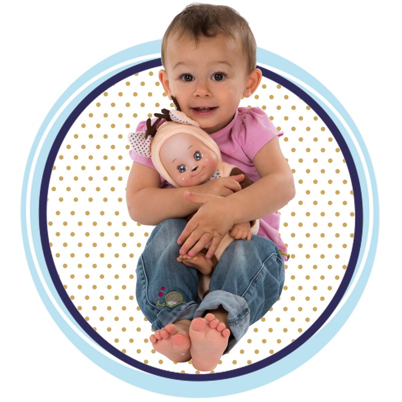 Śliczna, miękka lalka z serii MiniKiss dla najmłodszych dzieci od 12 miesiąca życia. Po naciśnięciu brzuszka wydaje dźwięk całusa. Lalka został ubrana w śliczne ubranko przypominające jelonka.