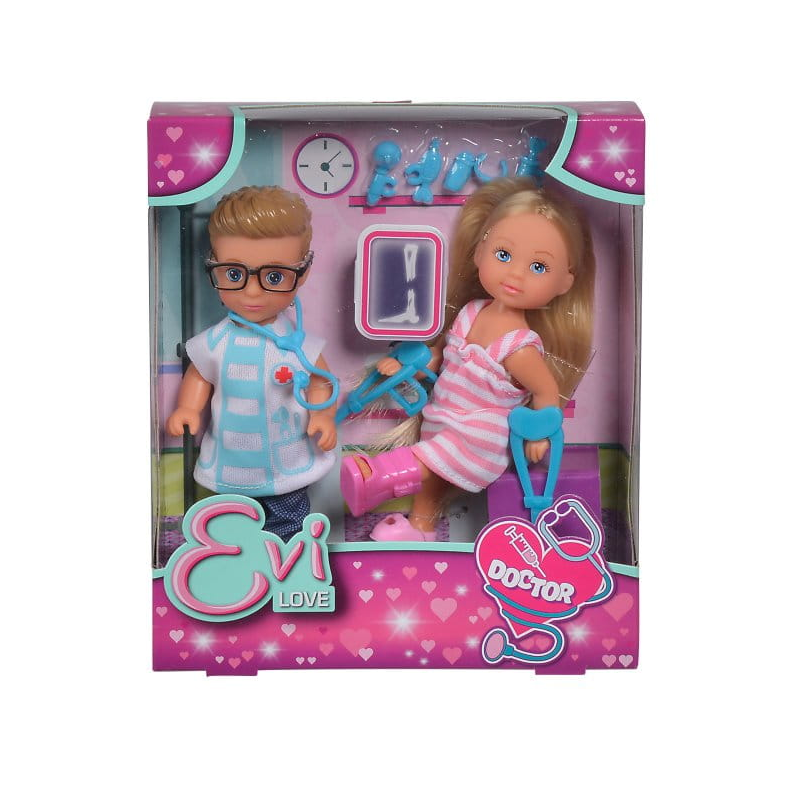 Laleczka z długimi, blond włosami, w sukience w różowo-białe paski i jednym bucie, trafiła na ostry dyżur ze złamaną nogą. Doktor Timmy ubrany w spodnie i bluzkę lekarską, założył gips na nogę Evi i zalecił chodzenie o kulach ortopedycznych aż do całkowitego wyleczenia. Zestaw zawiera dwie laleczki, akcesoria medyczne w sumie 10 elementów.