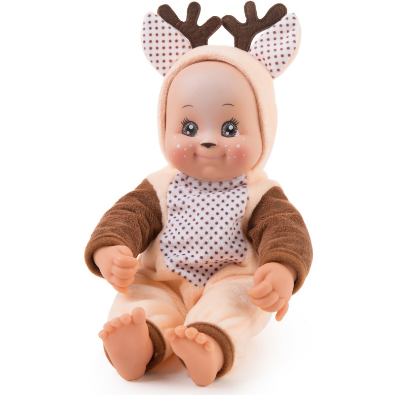 Śliczna, miękka lalka z serii MiniKiss dla najmłodszych dzieci od 12 miesiąca życia. Po naciśnięciu brzuszka wydaje dźwięk całusa. Lalka został ubrana w śliczne ubranko przypominające jelonka.