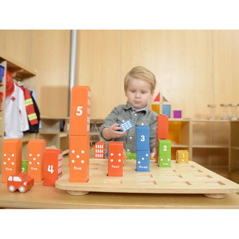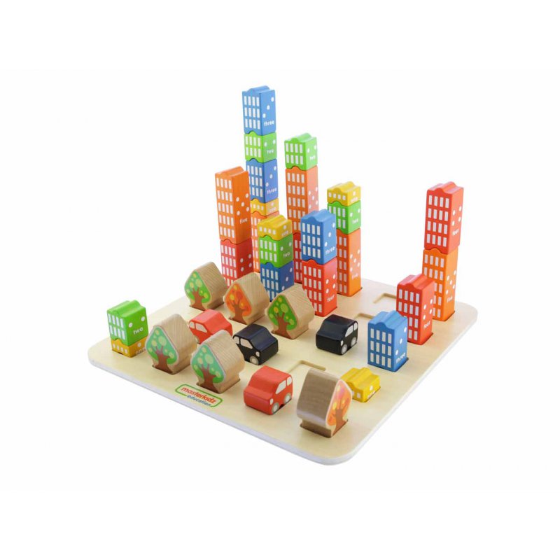 Na drewnianej planszy ułóż z dostępnych elementów swoje własne miasteczko - niepowtarzalne i kolorowe. Każdy maluch zachwyci się taką kreatywną zabawą, ale oprócz frajdy, zdobędzie też cenne umiejętności. Zabawka posiada funkcję matematyczną - tworząc wieżowce, używaj klocków o różnej wielkości i z różnymi liczbami narysowanymi. Łącząc je, dziecko ćwiczy dodawanie i odejmowanie!