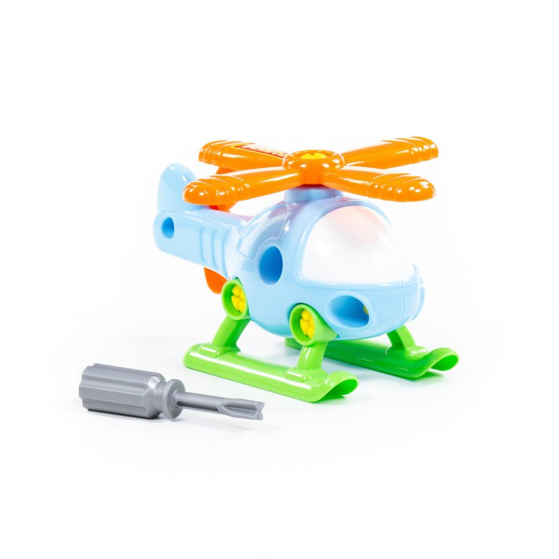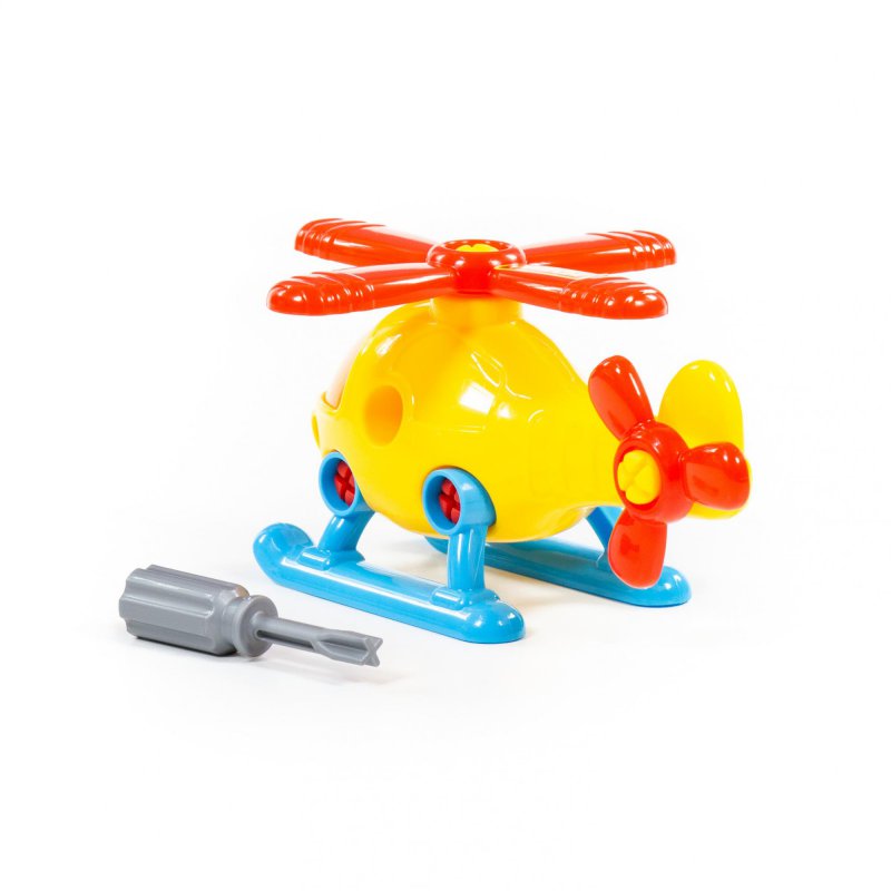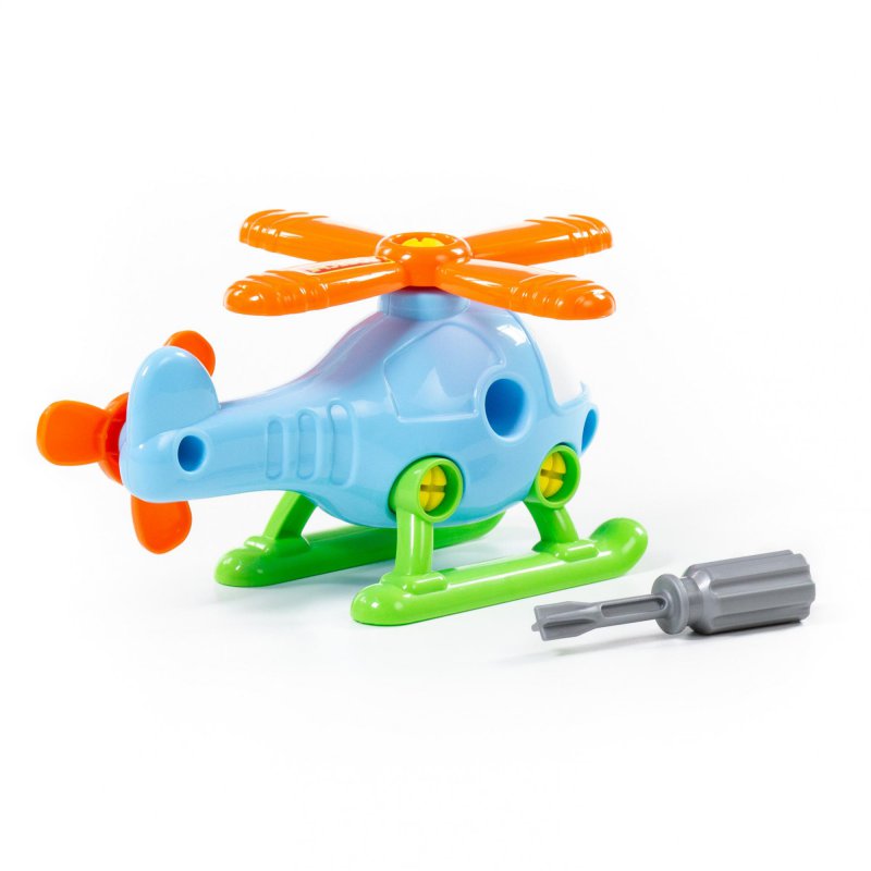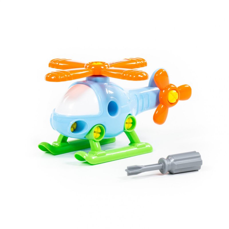 Kolorowy helikopter, który sprawi wiele radości każdemu dziecku, które lubi bawić się w pilota, naśladować żołnierza, oraz majsterkować. W zestawie znajduje się helikopter z ruchomymi śmigłami, które tak jak płozy i kokpit można odkręcać za pomocą dołączonego śrubokretu. Zabawka wykonana z ogromną starannością, z najwyższej jakości materiałów.