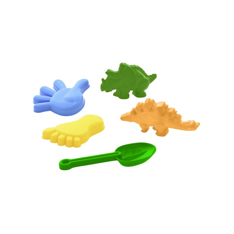 Dzięki ciekawemu wzorowi, Twoje dziecko od razu rozpozna na plaży swoje dzieło. W zestawie łopatka oraz cztery foremki: 2 w kształcie dinozaurów oraz stópka i rączka