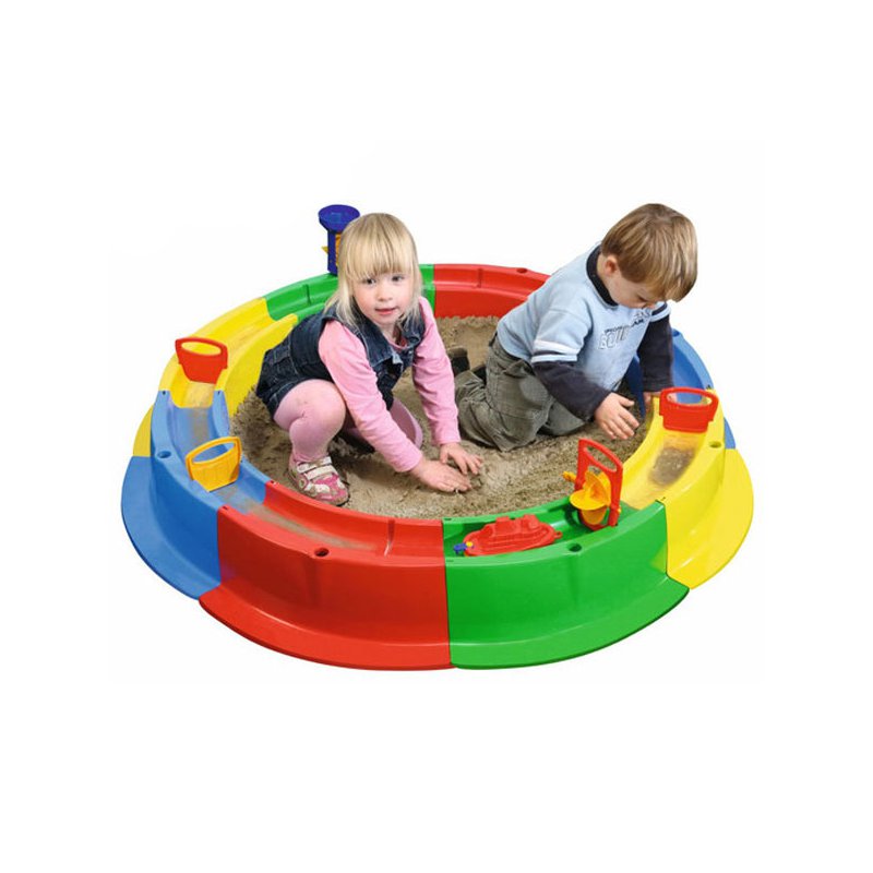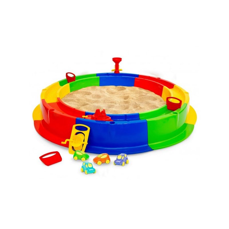 Piaskownica "Wodna Obręcz" składa się z 8 kolorowych elementów, które można łatwo i szybko złożyć w jedną całość.Brzeg piaskownicy tworzy rynnę, do której możemy nalać wody i stworzyć własny tor wodny dla zabawek.Idealne połączenie dla miłośników wody i piasku