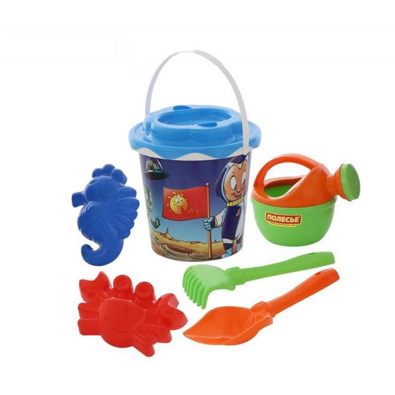 W Zestawie znajduje się: wiaderko, sitko, łopatka, grabki, konewka oraz 2 foremki.