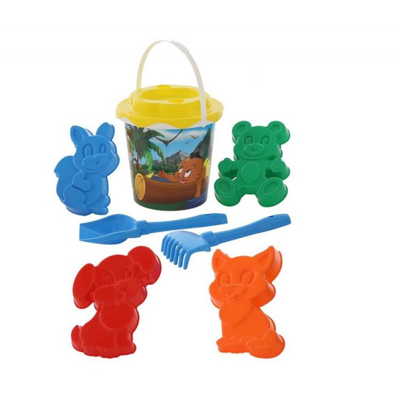 W Zestawie znajduje się: wiaderko, sitko, łopatka, grabki oraz 4 foremki.