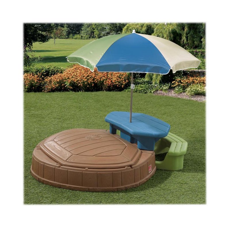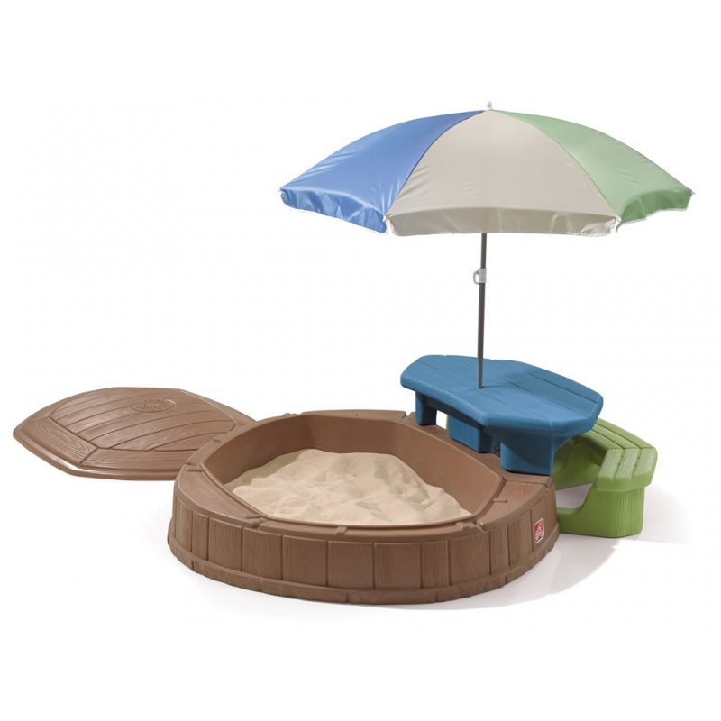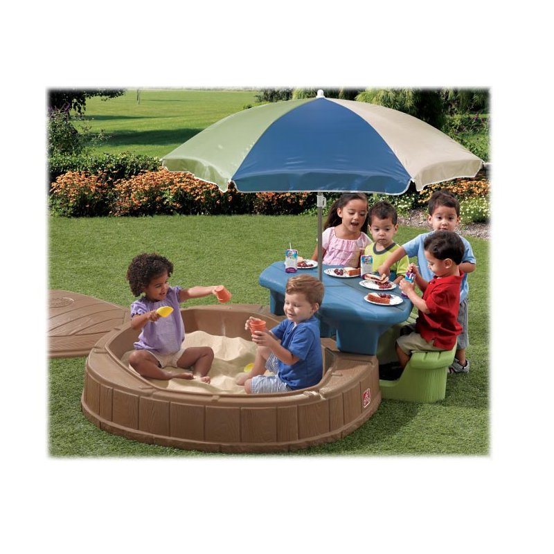 Połączenie w całość piaskownicy-basenu z wbudowanym stołem piknikowym i ławką, mieszczącą troje dzieci. Pokrywa piaskownicy ochrania piasek przed warunkami atmosferycznymi oraz niepożądaną działalnością zwierząt.