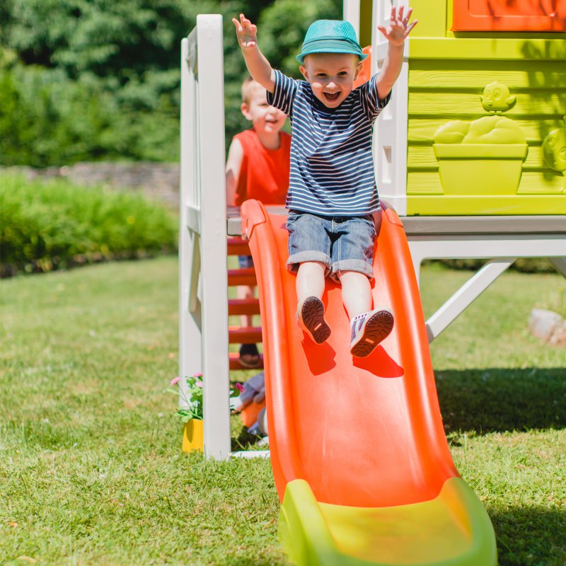 Plac zabaw, zjeżdżalnia, wspinaczka to fantastyczne połączenie domku do zabaw z wieżą do wspinaczki. Dwie faliste zjeżdżalnie o długości 135 cm i 100 cm.