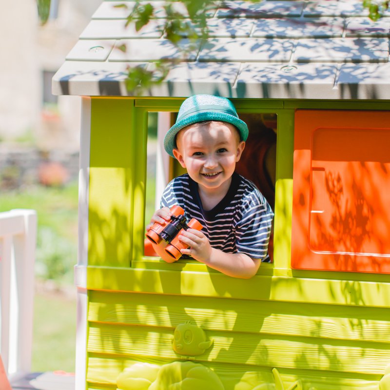 Domek na palach cenionego producenta zabawek dla dzieci francuska firmę Smoby. Domek umieszczono na podeście, w zestawie zjeżdżalnia 150 cm.