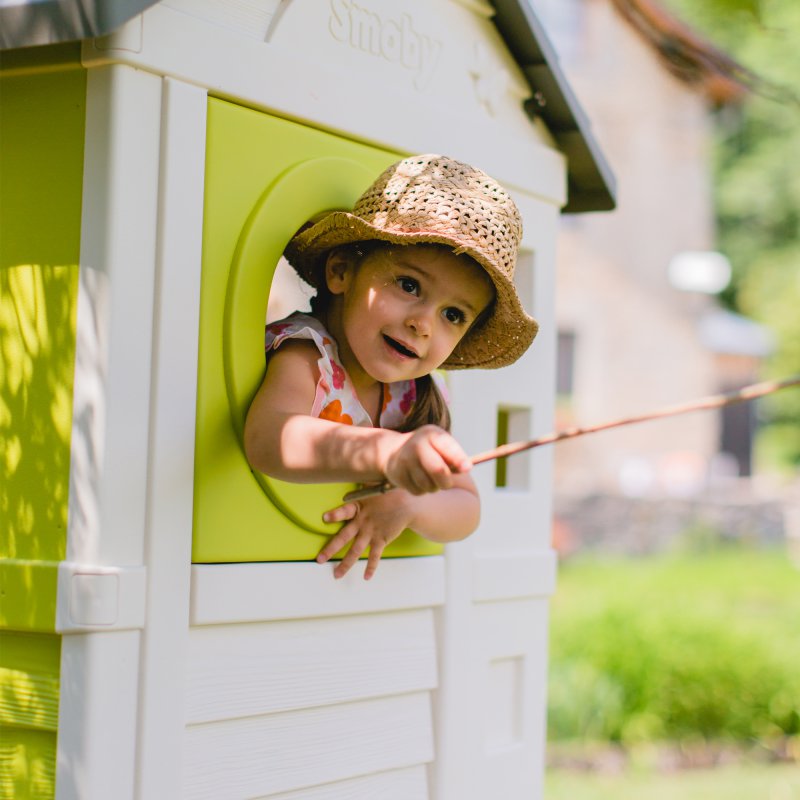 Domek na palach ze zjeżdżalnią cenionego producenta zabawek francuską firmę Smoby dla dzieci od lat 2. W wykonanym z wysokiej jakości tworzywa plac zabaw dominuje biel połączona z czerwienią zjeżdżalni oraz okiennicy,zielenią ścian i szarym dachem. Wyposażony został w: