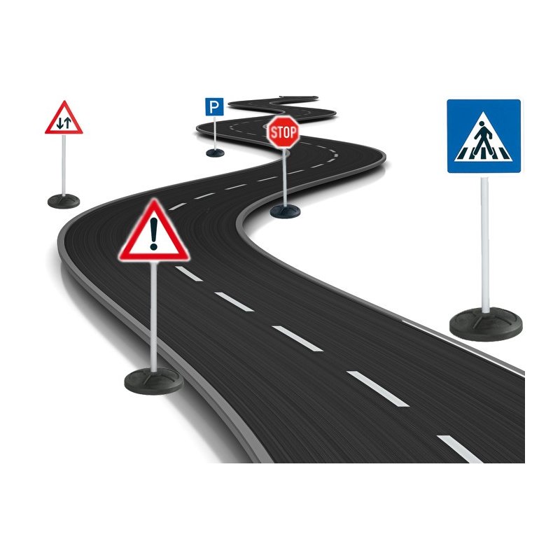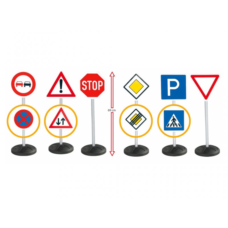 W zestawie znajdują się 10 tablic ze znakami oraz 6 stabilnych podstawek. Produkt świetnie się sprawdza przy uczeniu dzieci rozróżniania znaków na drodze. W trakcie zabaw dzieci poznają podstawowe znaki drogowe obowiązujące na drodze i przy okazji zasady jakie należy stosować w ruchu drogowym i pieszym.