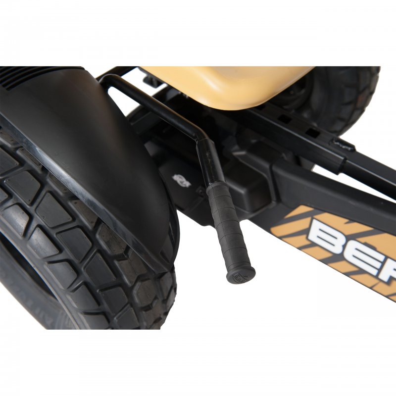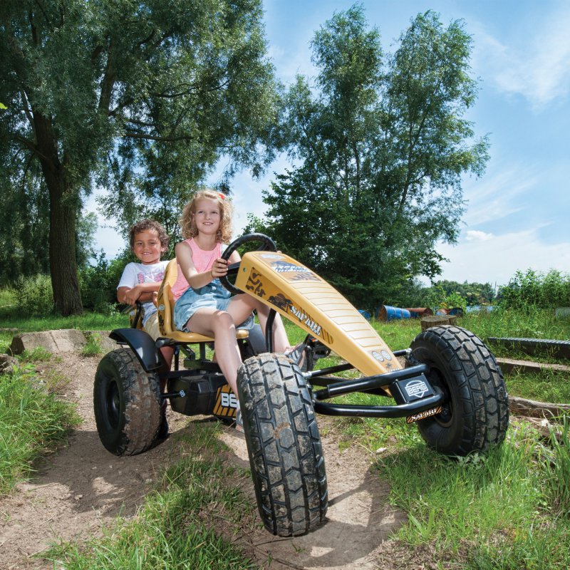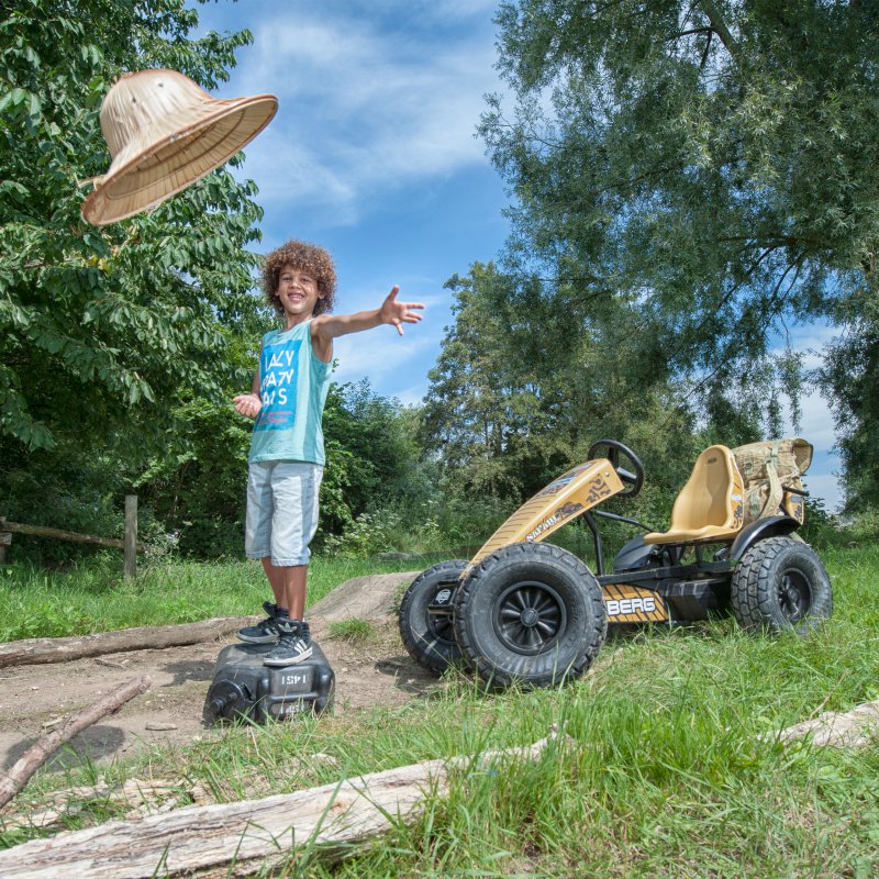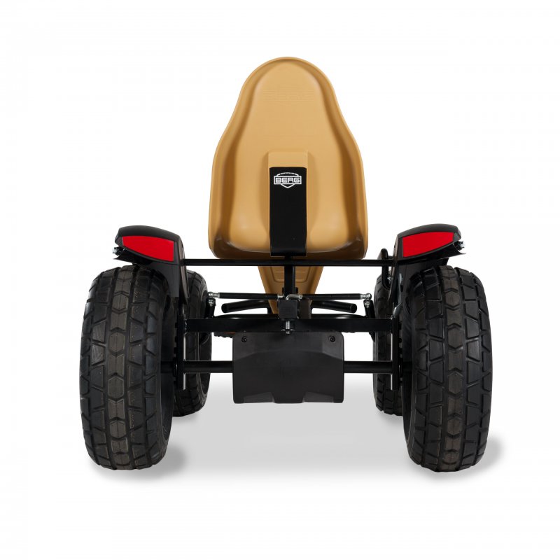 Dzięki sportowej kierownicy, uchylnemu zawieszeniu i uniwersalnemu bieżnikowi kontrola nad gokartem jest wyraźnie odczuwalna. Odpowiedzialne za dobre dopasowanie sylwetki kierowcy regulowane, sportowe siedzisko oraz bezdętkowe ogumienie zadbają o komfort jazdy. Teraz możesz jeździć jeszcze szybciej i bezpieczniej dzięki gładkim oponom, mocnym hamulcom i bardzo wytrzymałej ramie. Błotniki z odblaskami zapewniają bezpieczeństwo oraz chronią przed chlapaniem. Pojazd ma możliwość rozbudowy o akcesoria Berg np. przyczepka, syrena z megafonem, licznik elektroniczny.