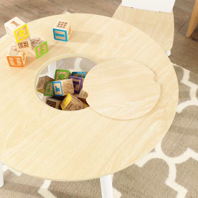Nowoczesny, drewniany stolik w zestawie z 2 krzesełkami w uniwersalnym kolorze. Stolik można wykorzystać zarówno do malowania, grania w ulubione gry lub do odrabiania lekcji. Dodatkowo został wyposażony w poręczny siatkowy schowek umieszczony na środku stolika, który pomieści kredki, flamastry i inne drobiazgi.