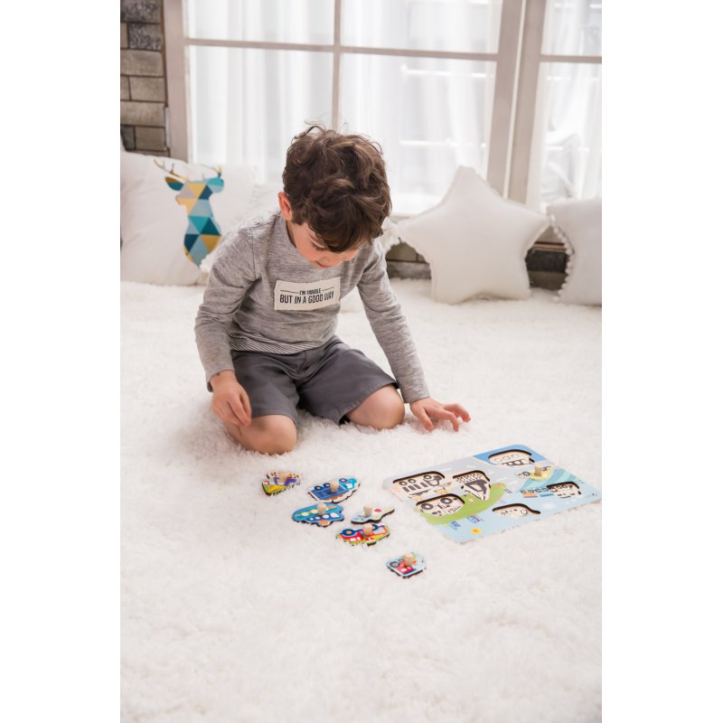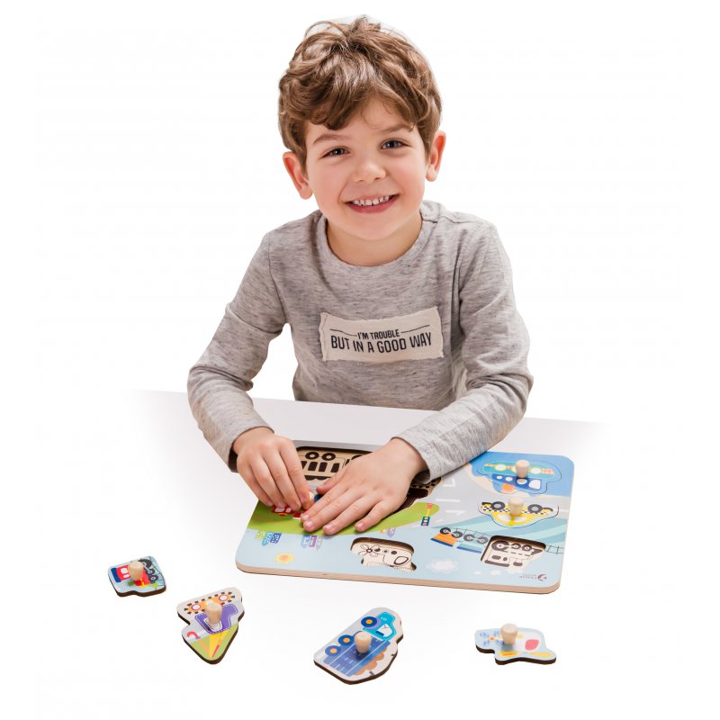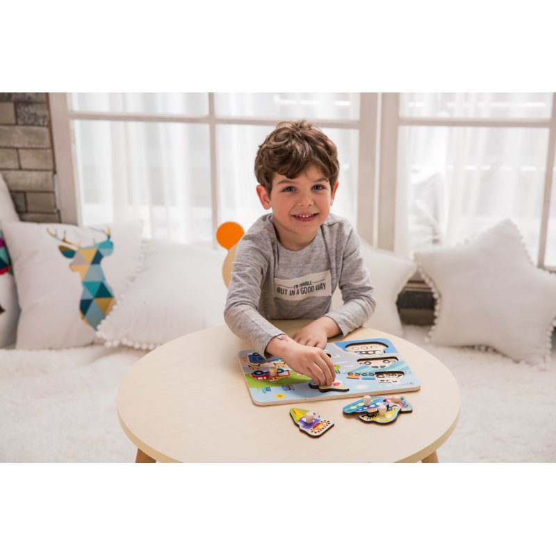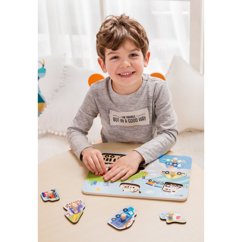 Drewniane Puzzle dźwiękowe Pojazdy cenionego producenta zabawek Viga Toys dla dzieci od 18 miesiąca życia idealne do przedszkola jak i do domu.