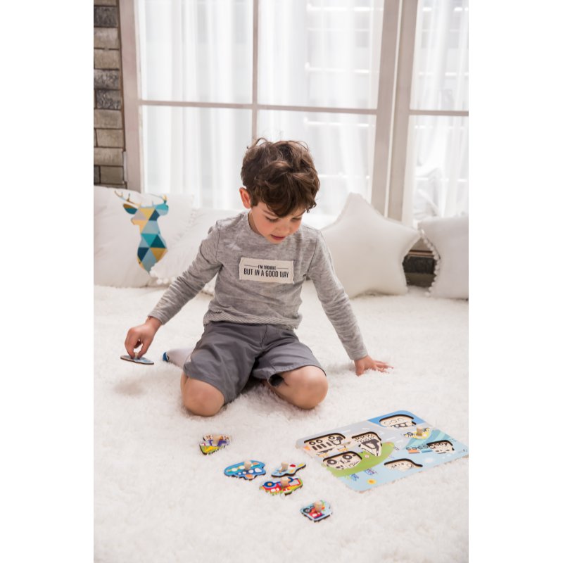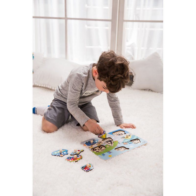 Puzzle pinezkowe marki Classic World o motywie Ruchu drogowego to świetna zabawka dla dzieci w wieku od 18 miesiąca życia. Posiada 8 elementów, oraz planszę, do której należy je przyczepić. Gdy wszystkie fragmenty zostaną umieszczone w odpowiednich miejscach, otrzymamy cały obrazek.
