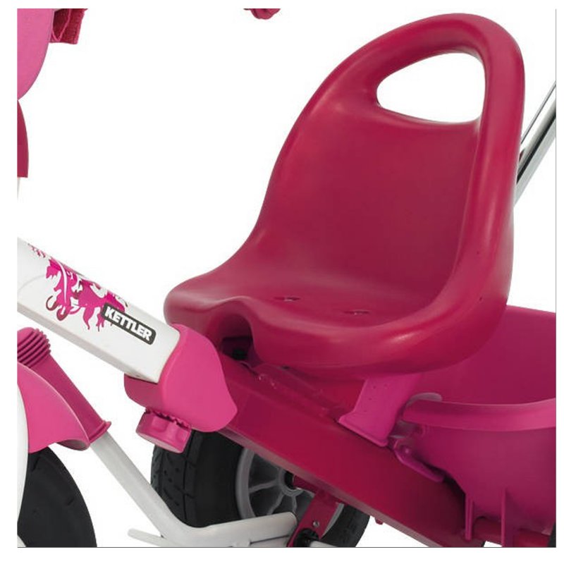 Trójkołowy rowerek Kettler z pompowanymi kołami to świetny pomysł dla każdej dziewczynki. Rowerek jest bardzo wygodny, posiada profilowane siedzisko z funkcją regulacji, wolne koło, hamulec w rączce oraz rączki wyposażone w gumowe osłonki, które ochronią małe rączki przed otarciami. Rama posiada 4-stopniową regulację, a do tego pokryta jest ekologiczną farbą. Rodzic może kontrolować jazdę malucha dzięki drążkowi do prowadzenia, a do tego mamy tu możliwość zablokowania kierownicy. Dodatkowo producent zadbał o to, żeby maluch miał specjalne miejsce na przewożenie swoich drobiazgów - znajdziemy tu pojemnik oraz torbę.