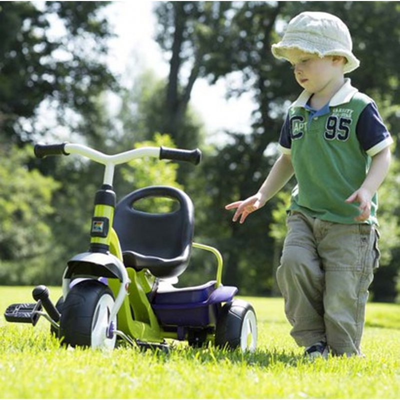 Rowerek trzykołowy Balade zielony dla dzieci od 10 miesiąca cenionego producenta zabawek francuskiej firmy Smoby.Wyposażony w ciche koła, pasy bezpieczeństwa, regulowaną rączkę zapewni komfort podczas spaceru zarówno dziecku jak i mamie.