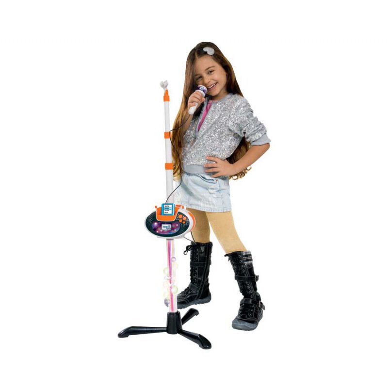 Zabawka jest przystosowana do współpracy z każdym odtwarzaczem Mp3, dzięki czemu mała artystka będzie mogła śpiewać swoje ulubione piosenki. Aktywny głośnik w formie boomboxa może być zamontowany na statywie, bądź używany jako samodzielne, przenośne urządzenie. Dzięki temu rozwiązaniu możesz zabrać swój zestaw karaoke gdzie tylko zechcesz. Mikrofon wprowadzi Twoje dziecko w świat muzyki.