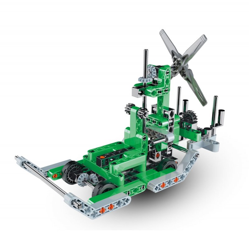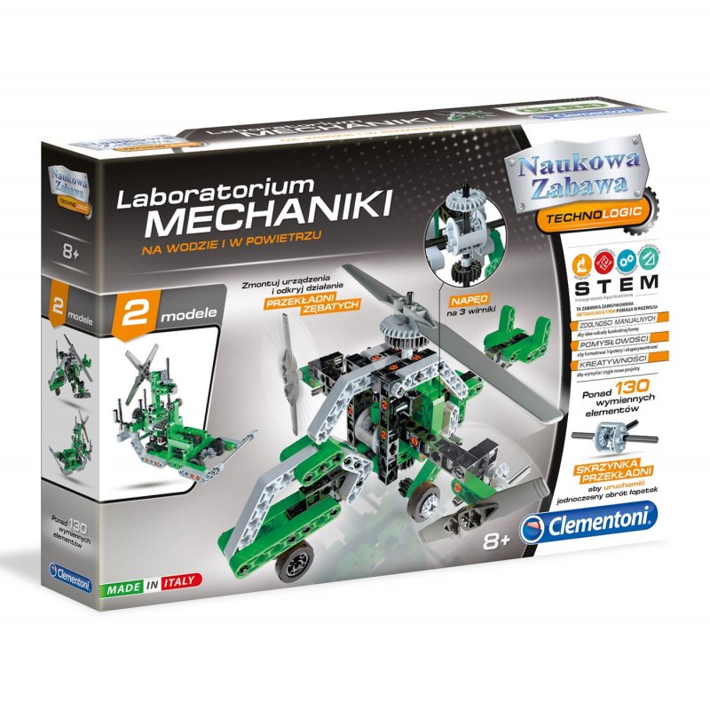 Laboratorium Mechaniki - Na wodzie i w powietrzu to naukowy zestaw stworzona przez cenionego producenta zabawek dla dzieci, włoską firmę Clementoni. Dzięki takiemu zestawowi dowiesz się jak działają ukłądy napędowe i skonstruujesz aż 2 w pełni działające modele. Zmontuj urządzenia i odkryj działanie przekładni zębatych!