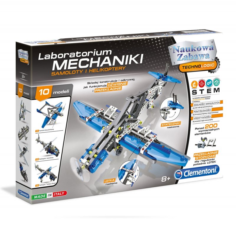 Laboratorium Mechaniki – Samoloty i Helikoptery to naukowy zestaw stworzony przez cenionego producenta zabawek dla dzieci, włoską firmę Clementoni. Dzięki takiemu zestawowi dowiesz się jak działają układy napędowe i skonstruujesz aż 10 w pełni działających modeli. Składaj konstrukcje i odkrywaj, jak funkcjonują dźwignie i przekładnie.