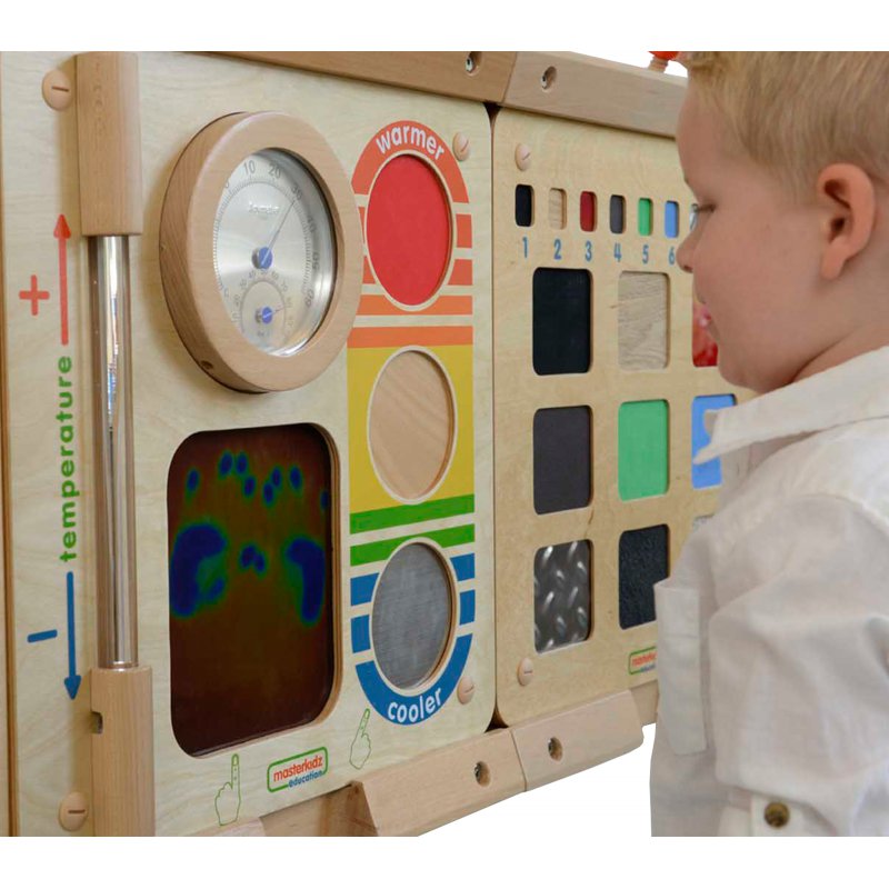 Fantastyczna tablica edukacyjna, dzięki której dziecko może nauczyć się o temperaturach. Na tablicy mamy kilka pól: ciepłe, neutralne, zimne, oraz tablicę ciepłoczułą, na której widzimy odciski ciepłej dłoni. Na tablicy znajduje się również termometr.