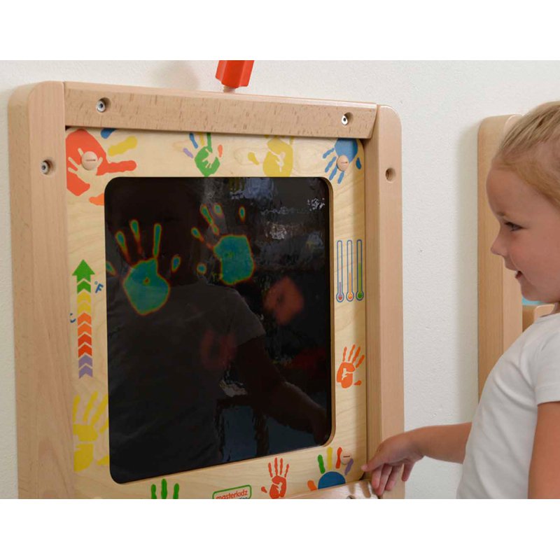 Duża tablica o wielkości 46 x 46 cm pozwala na zabawę wielu dzieci jednocześnie. Wszystkie dzieci mogą dotykać tablicy i porównywać odciski, które powstają. Można w ten sposób określić kto ma cieplejsze dłonie, a komu marzną rączki. Zabawa jest bardzo wciągająca, zwłaszcza jeśli bawi się cała gromadka.
