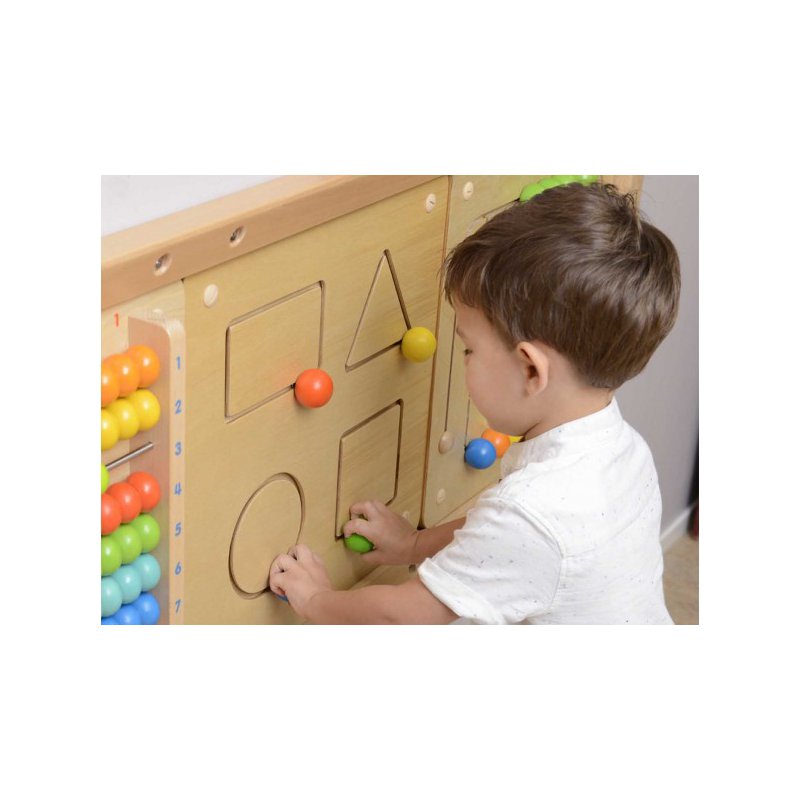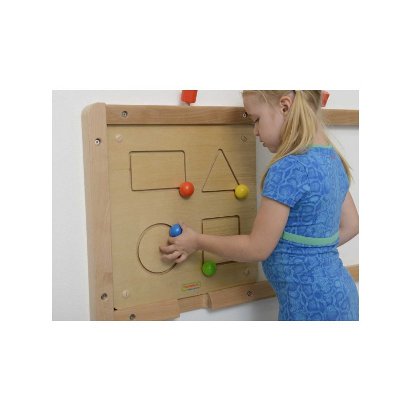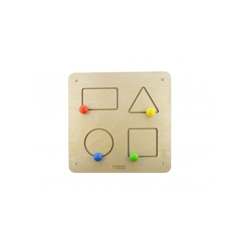 Tablica przesuwnych kształtów geometrycznych pomaga rozwinąć umiejętności motoryczne. Usprawnia także naukę kształtów podczas gry. 4 podstawowe kolorowe pokrętła mogą być również używane w grach wykorzystujących rozpoznawanie kolorów.