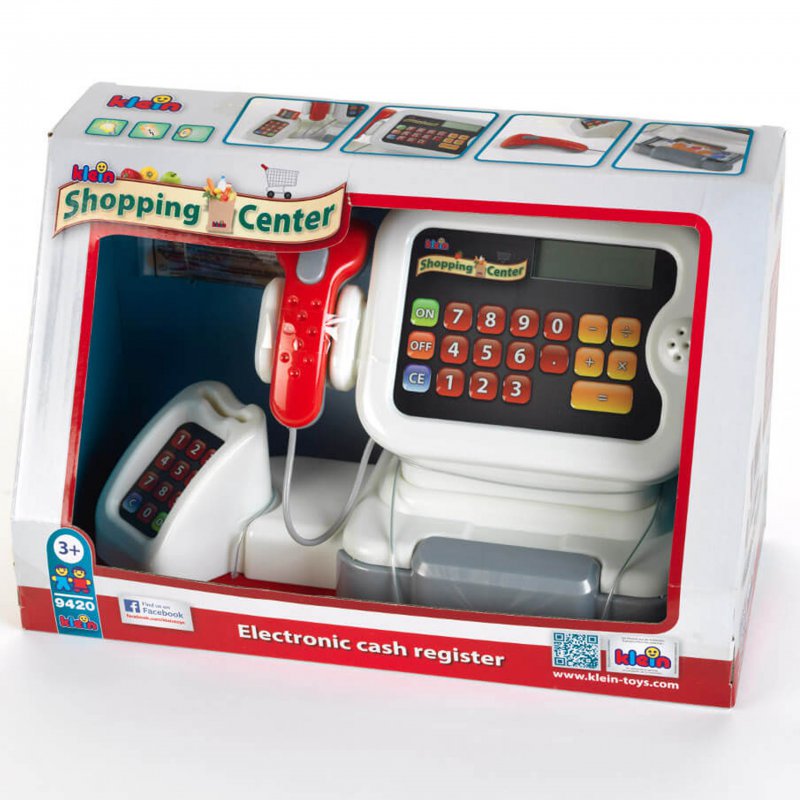 Elektroniczna kasa sklepowa z wyposażeniem renomowanej firmy Klein. Zabawka wykonana z najwyższej jakości materiałów. Kasa posiada w pełni funkcjonalny wyświetlacz wraz z kalkulatorem z czytelna klawiaturą. Szufladkę kasy można otwierać, w zestawie znajdują się banknoty, monety oraz karta płatnicza.