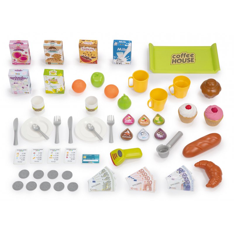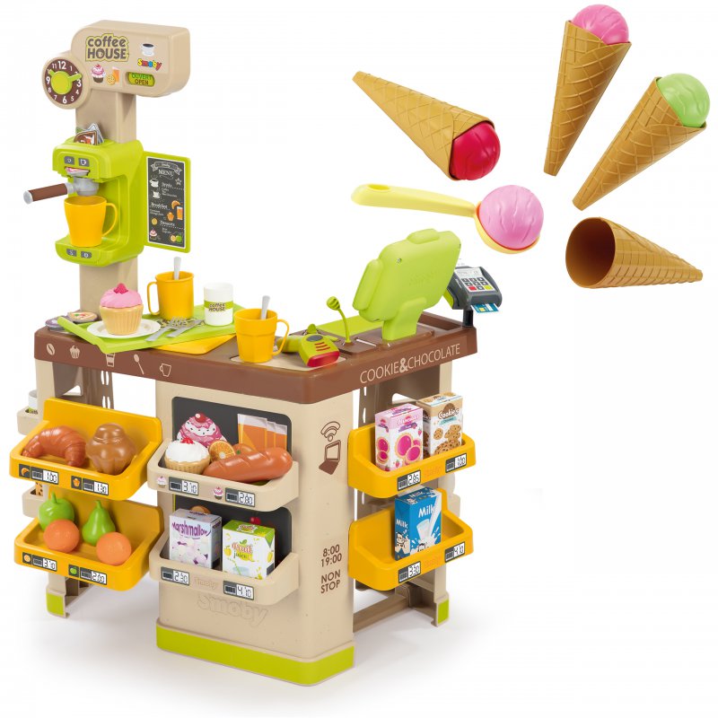 Sklep - Kawiarenka cenionej francuskiej firmy Smoby zaprojektowana dla dzieci od lat 3 duży zestaw do domu i przedszkola z licznymi akcesoriami do zabawy.