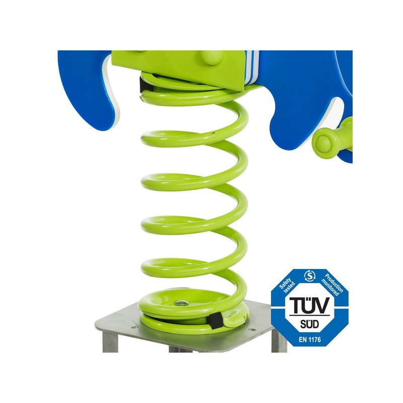 Zestaw do samodzielnego montażu. Panele wykonane z płyty HDPE (polietylen wysokiej gęstości) wszystkie o grubości 19mm. Powierzchnia paneli odporna na zarysowania oraz warunki atmosferyczne. Panele posiadają nadruki graficzne. Wzmocnione uchwyty i podnóżki, z profilem antypoślizgowym zgodne z najnowszą normą EN 1176. Sprężynowiec bujak montujemy również na specjalnych metalowych podstawach, które można wstawić w dowolne miejsce. Najwyższej jakości sprężyna wraz z zestawem montażowym, malowana proszkowo i przebadane na 500 000 cykli. Jednoczęściowa kotwa gruntowa ze stali galwanizowanej ogniowo. Wszelkie metalowe łączniki są zabezpieczone specjalnymi plastikowymi zaślepkami co poprawia w znacznym stopniu estetykę i bezpieczeństwo urządzenia. Przy zakupie dołączona jest instrukcja użytkowania bujaka sprężynowego.
