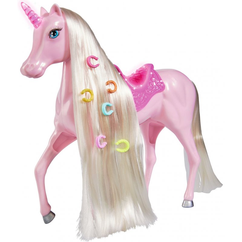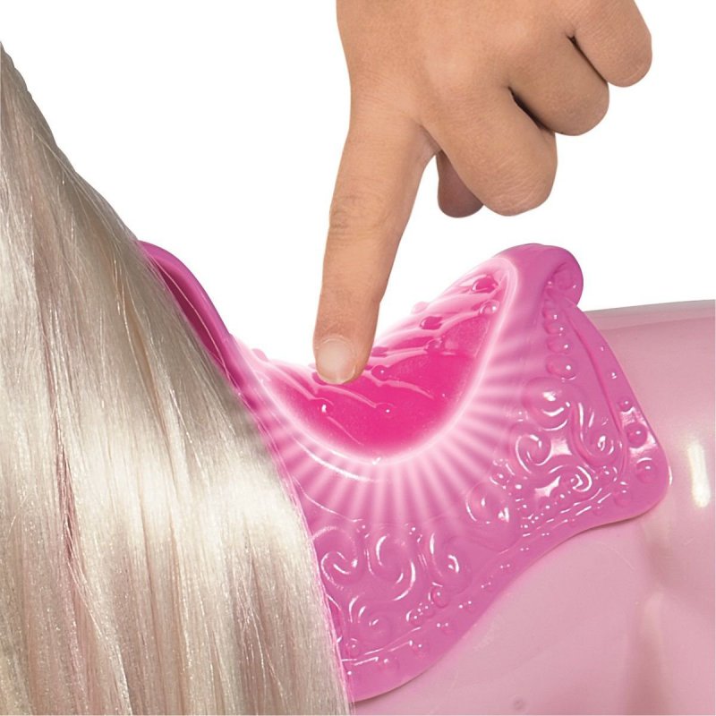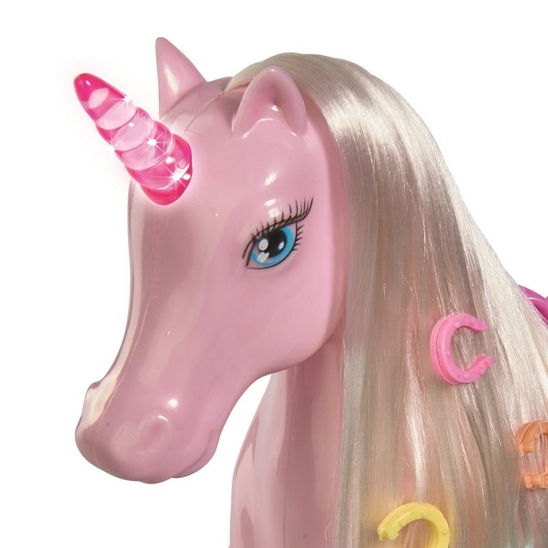 Jednorożec z długą grzywą do czesania. W zestawie dołączono zapinki do grzywy i grzebień. Konik posiada świecący róg, a także siodło.
