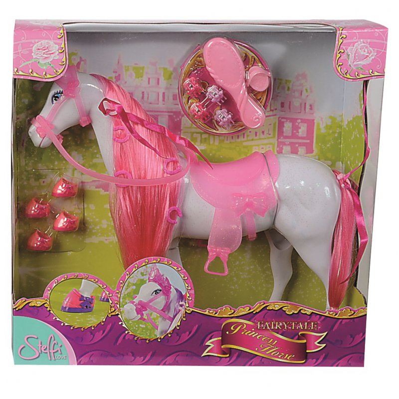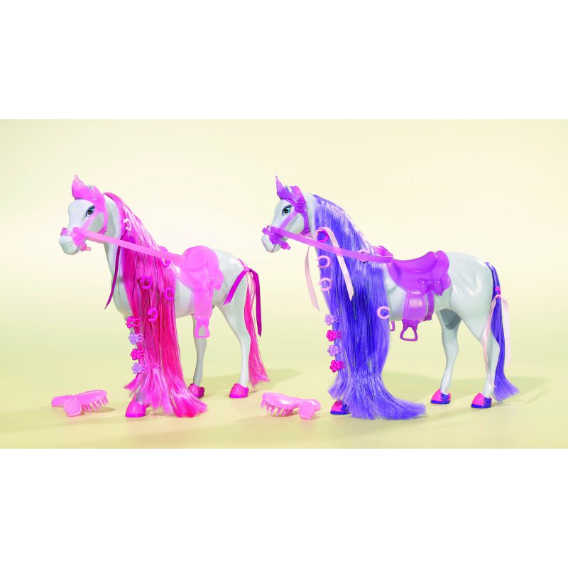 Koń z bardzo długą grzywą, z wymiennymi kopytami, z uprzężą i wieloma akcesoriami do pielęgnacji grzywy. Wspaniały dodatek do zabawy lalkami Stefii – pozwala dzieciom wymyślać niezwykłe, bajkowe przygody. Koń z różową grzywą