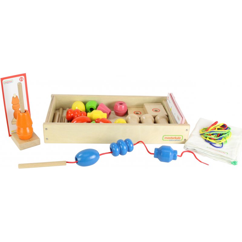 Zestaw składa się z drewnianego pudełka, zestawu koralików, 3 stojaczków, oraz materiałowego pokrowca na koraliki z logiem Masterkidz.