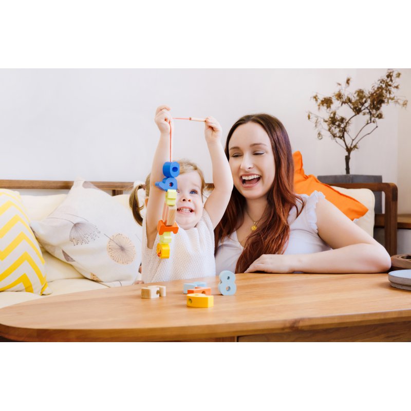 Zestaw różnorodnych koralików, które mogą służyć do sortowania, liczenia, oraz dopasowywania kształtem, kolorem itp. Zabawka zawiera 4 drewniane stojaczki do sznurowania, oraz 8 dwustronnych kart, które zapewniają 16 zadań do wykonania dla bawiącego się dziecka.
