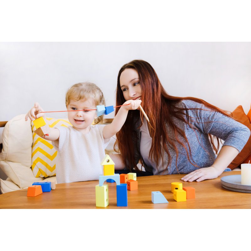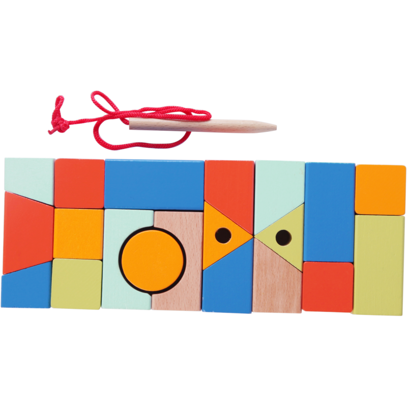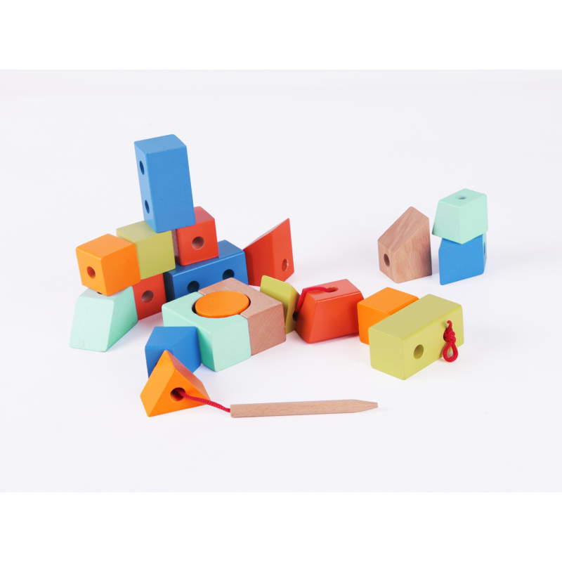Zabawka wykonana z pieczołowitością- każdy z 12 elementów został ręcznie pomalowany z obu stron. Piękne i kolorowe klocki zachęcą do zabawy. W zestawie z klockami jest sznureczek z drewnianym bolcem- który posłuży do nawlekania klocków w dowolnej kolejności.