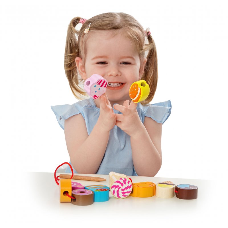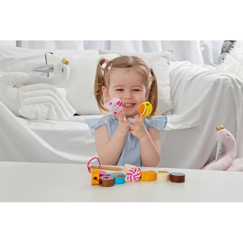 Drewniana zabawka marki Classic World, która jest idealnym prezentem dla dziecka w wieku od 18 miesięcy. Jest to przeplatanka, która składa się z 13 elementów: 12 koralików przedstawiających słodycze, ciasteczka, oraz inne desery, oraz ze sznureczka, który należy przeplatać przez koraliki.